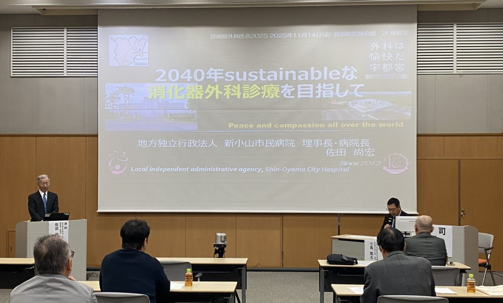 2025年11月14日宮崎県外科医会秋期講演会が宮崎県医師会館にて開催されました。現地参加13名、Web参加14名でした。特別講演は、2024年に第87回の日本臨床外科学会総会を開催された前自治医科大学病院長の佐多尚宏先生に「2040年sustainableな消化器外科診療を目指して」のご講演を頂きました。座長は宮崎大学外科学講座肝胆膵外科学分野教授七島篤志先生にお願いしました。ご講演の中で、消化器外科医が減少する中で、自治医科大学にて取り組まれた、変形労働時間制度(週4日間10時間勤務)、業務の効率化(仕事に人をつける。手術をパート毎に分けて術者をつける)の有用性、栃木県の中での地域での連携・分担、特に緊急手術を行う体制整備。医師会との連携強化を行い、外科医の確保に関する要望書を県へ提出し、外科医に対するインセンティブについて要望した。など精力的に外科医の勤務環境整備に取り組まれていることに感銘を受けました。宮崎においても外科医不足は深刻で、2040年に向けた取り組みの必要性を感じました。
